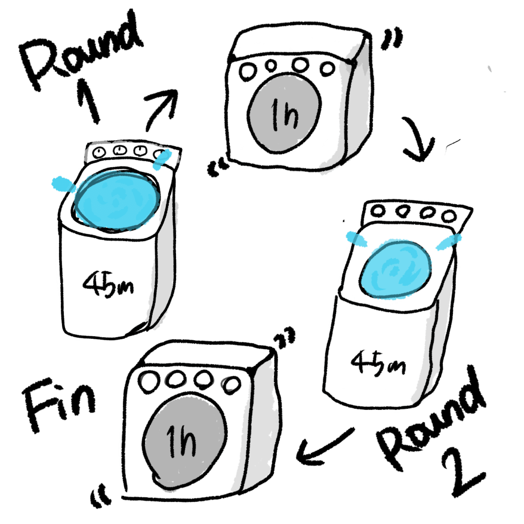 ルームシェアに住んでいる私は、洗濯できる日が週に1日と決まっています。1週間分の服が溜まっているので、薄いタオルやTシャツ、下着などで1回、ジーンズや、パーカー、ジャージなどの分厚いもので1回、定期的に布団のシーツなどを洗う日があるので、その場合は1日に3回回す日もあります。
