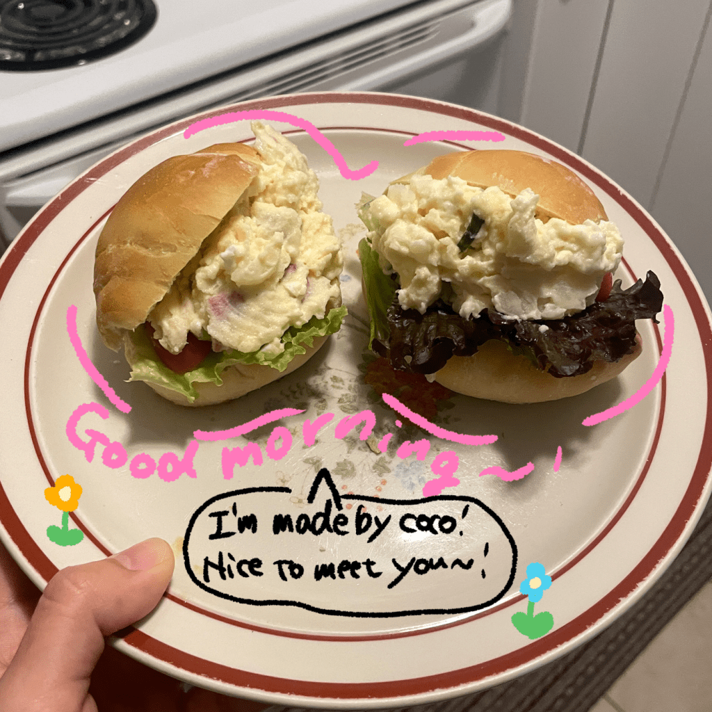 次の日の朝食は、作ったロールパンにポテトサラダをサンドして食べました。