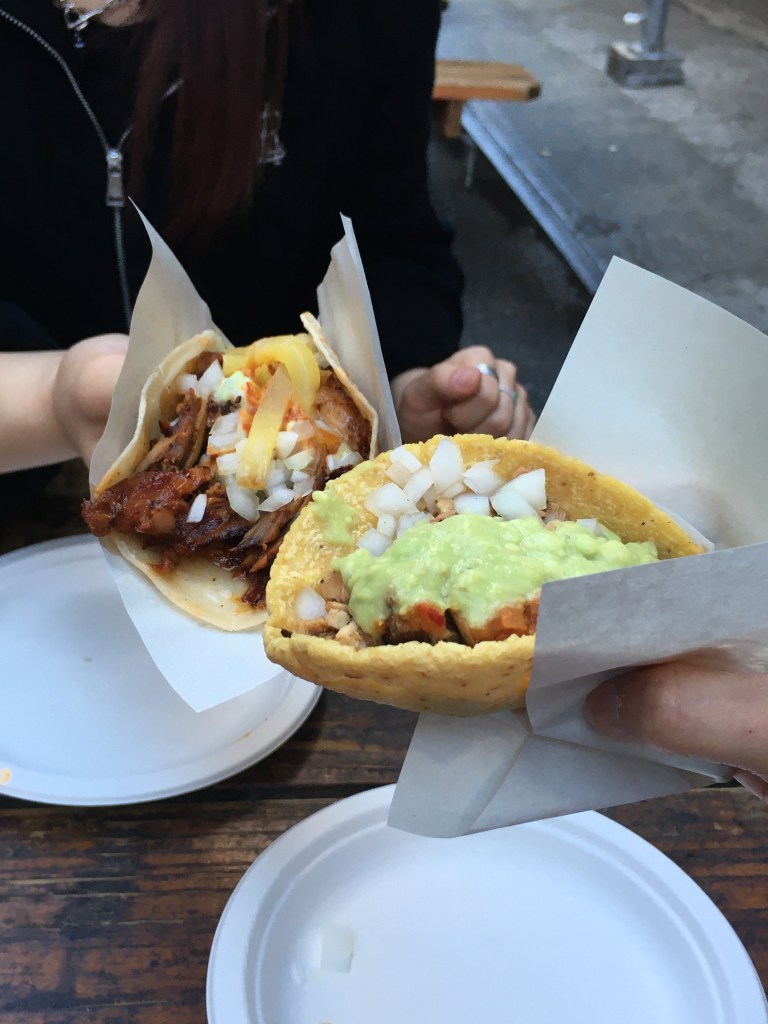 私は牛肉のタコスを注文しました。Sophieは鶏肉だったかな?中のお肉に合わせてそれ以外のトッピングやソースも変わるみたいで、私はチリソースのような辛いソースがかかっていましたが、Sophieのにはアボカドのソースがかかっていました。