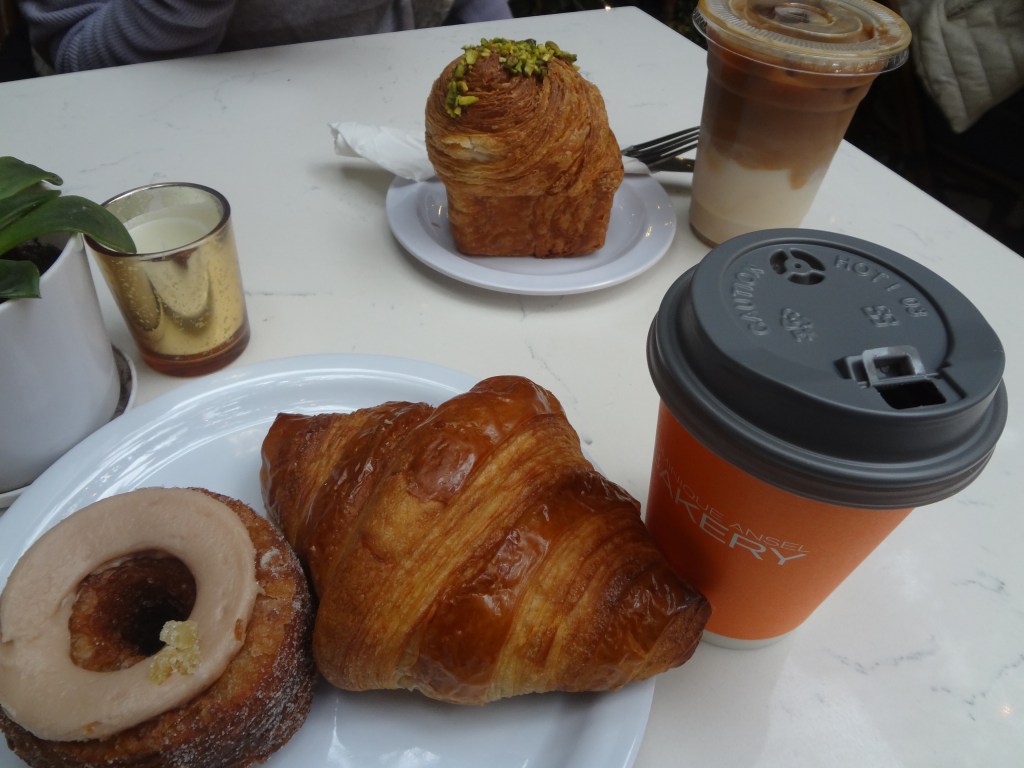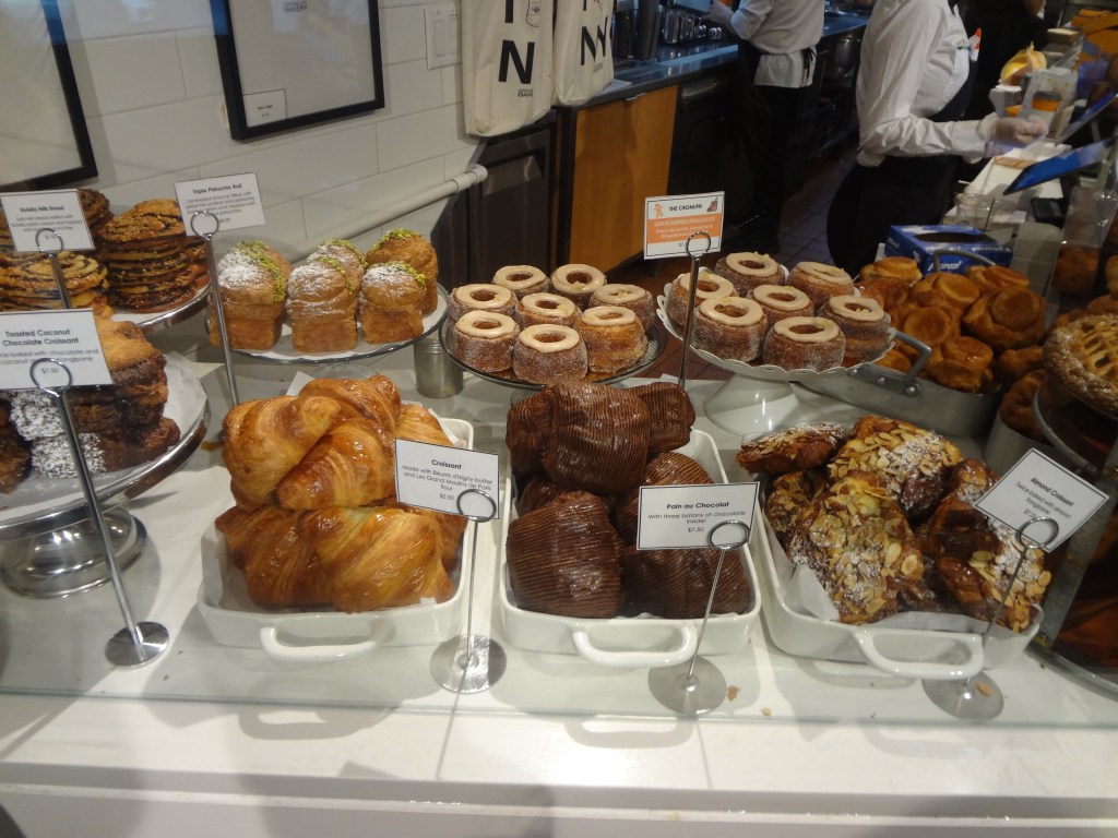 本当にたくさんの種類のパンやケーキが並んでいて、何を食べようかすごく悩みましたが、私はどのパン屋さんに行っても必ずクロワッサンは食べるのでまずそれと、店員さんにお勧めを聞いて、Cronutという写真奥の列にあるドーナツのような見た目のパンを注文しました。
