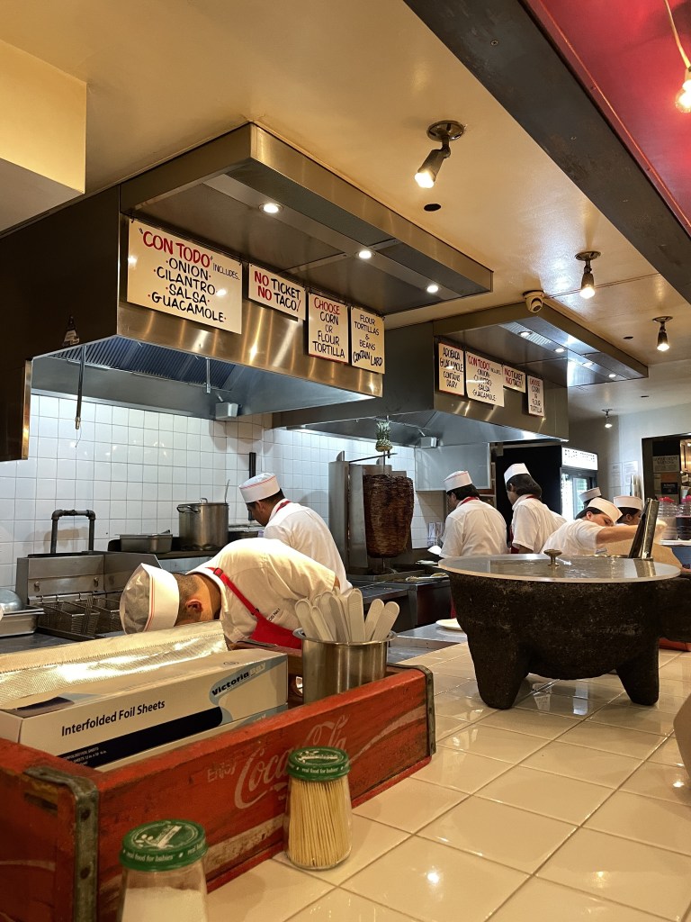 タコスの中の具材は牛、鶏、豚、カクタス(サボテン??)の4種類から選べて、その他トルティーヤの種類も小麦粉かとうもろこし粉か選択する注文方法になっていました。厨房のスタッフがしきりになにか聞いてくるんですが何も聞き取れなくて、結局2種類のトルティーヤを見せてくれて、やっとそれも選べることを理解しました。