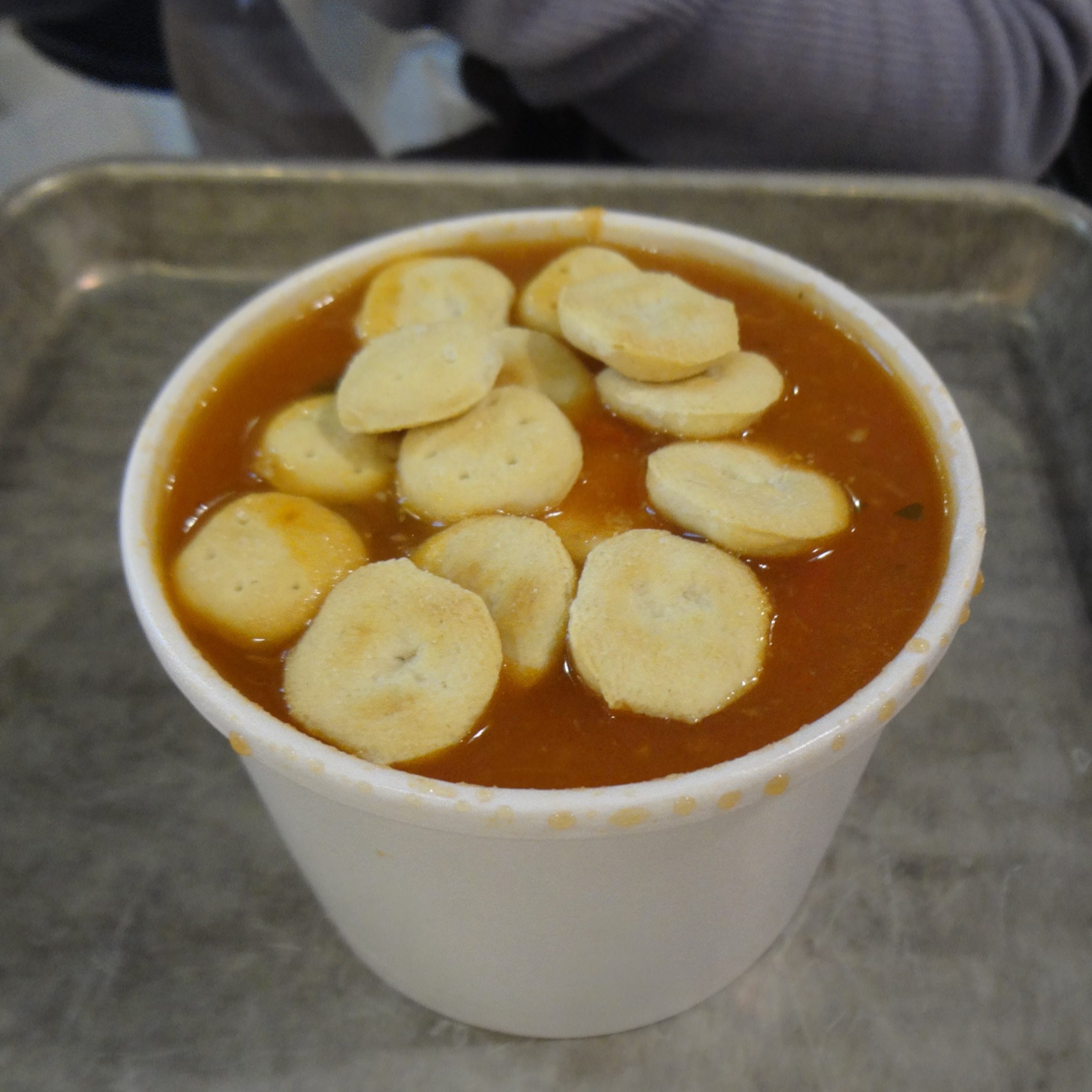 頼んだのはマンハッタンクラムチャウダーで、想像していた白いスープではなく、赤色のスープでした。トマトベースのスープで、細かくカットされた野菜とクラムがたくさん入っていてとても美味しかったです。